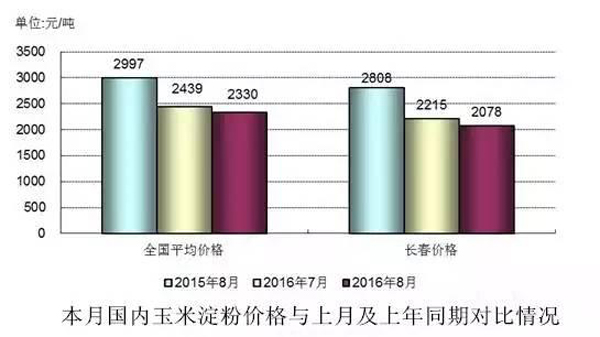 2016年7-8月份國內淀粉價格先跌后漲,總體仍呈下跌趨勢。8月份全國淀粉平均價格為2330元/噸,環(huán)比下降108元/噸,降幅4.45%;同比下降667元/噸,降幅22.25%。其中,長春地區(qū)淀粉出廠價格為2078元/噸,環(huán)比下跌137元/噸,降幅6.18%;同比下降730元/噸,降幅25.99%。