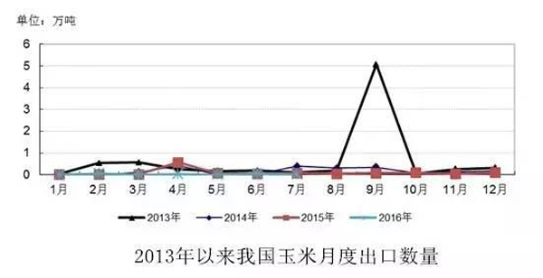 海關數據顯示,7月份我國玉米出口量為50噸,8月份出口420噸。2015/16年度以來累計出口0.38萬噸,同比下降66.55%。近年來國內玉米出口維持下降趨勢。由于頭號出口大國美國玉米下一年度預計豐產,且出口報價較低,2016/17年度我國玉米出口將非常有限。