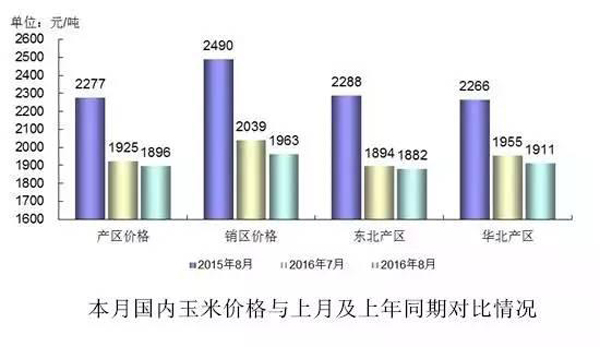 2016年8月份,我國玉米產區(qū)平均價格1896元/噸,比上月下降28元/噸,降幅1.48%;同比下降381元/噸,降幅16.73%。其中,東北產區(qū)價格為1882元/噸,環(huán)比下降12元/噸,降幅0.66%,同比下降407元/噸,降幅17.77%;華北黃淮產區(qū)價格為1911元/噸,環(huán)比下降44元/噸,降幅2.27%,同比下降355元/噸,降幅15.68%;國內銷區(qū)玉米價格為1963元/噸,環(huán)比下降76元/噸,降幅3.75 %,同比下降527元/噸,降幅21.18%(圖)。