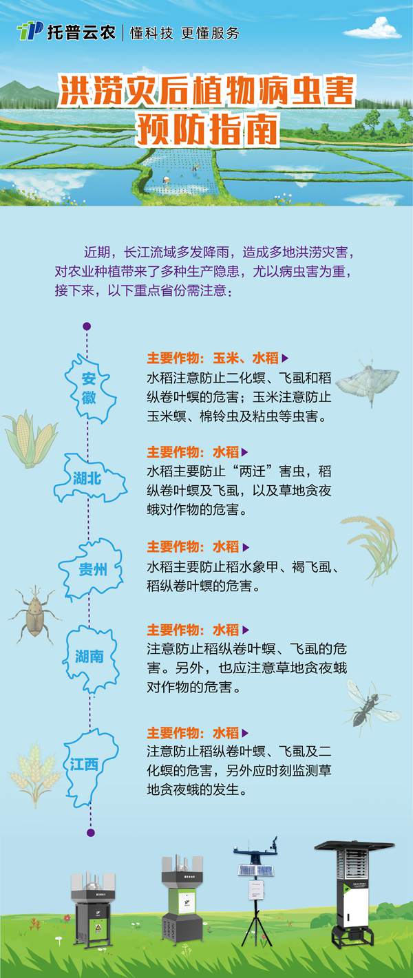 災(zāi)后巡檢雖已結(jié)束,但災(zāi)后生產(chǎn)還需長(zhǎng)期防范,除了借助我們托普云農(nóng)的智能裝備,大家還需要注意日常的病蟲害預(yù)防。我們特地整理了一份《病蟲害預(yù)防指南》,對(duì)各省重點(diǎn)蟲害做了介紹,希望對(duì)大家有所幫助!