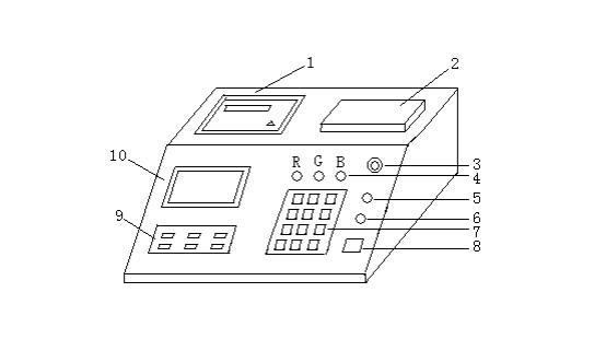 1、打印機;2、養份測定比色裝置暗合;3、pH 及鹽量電極插座;4、養份測定光源指示燈;5、充電指示燈;6、電源指示燈;7、儀器使用輸入組合鍵;8、儀器軟鍵自動控制開關;9、儀器功能控制組合鍵;10、液晶漢字菜單顯示屏。