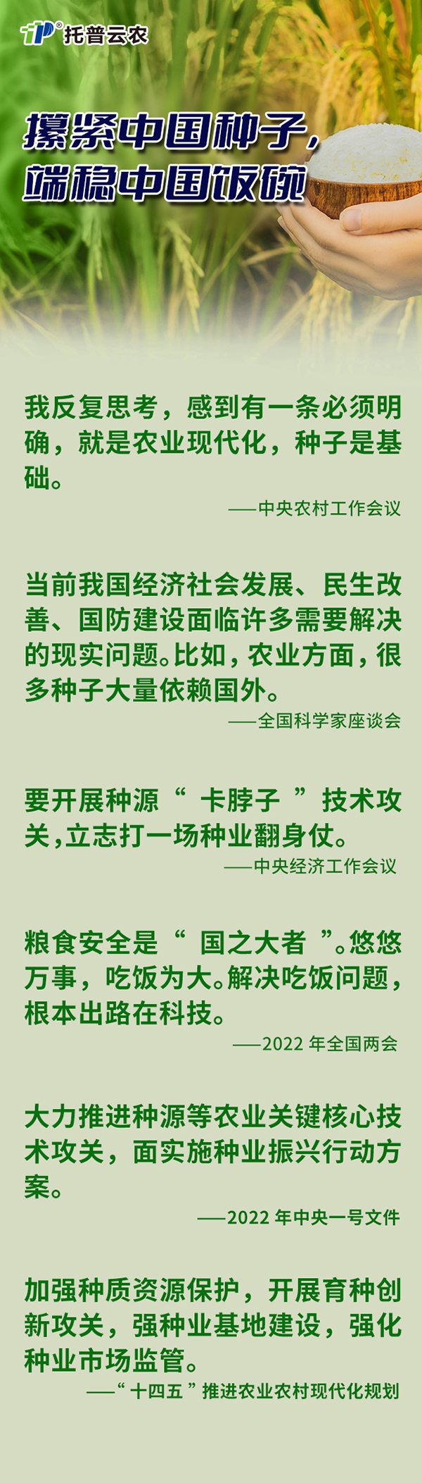 “種子是我國糧食安全的關(guān)鍵。只有用自己的手攥緊中國種子,才能端穩(wěn)中國飯碗,才能實現(xiàn)糧食安全。”這不是中央第一次提到種業(yè)發(fā)展問題,從中央農(nóng)村工作會議到“十四五”農(nóng)業(yè)農(nóng)村現(xiàn)代化發(fā)展規(guī)劃多次提出要把“種業(yè)發(fā)展”放到事關(guān)發(fā)展全局和國家安全的戰(zhàn)略大事上。