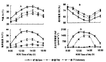圖 不同光環(huán)境下氣溫、相對濕度、地表溫度、光合有效輻射等生態(tài)因子日變化