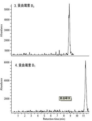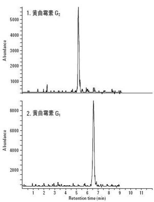 黃曲霉素是黃曲霉菌、寄生曲霉菌產生的代謝物,劇毒,同時有致癌、致畸等作用。會引起人體骨骼,內臟器官等的病變,甚至癌變。黃曲霉菌廣泛存在于土壤中,因此一般的作物如花生、玉米、大米等農作物都很容易感染黃曲霉菌。另外如胡桃、杏仁等干果也可能含有黃曲霉素。黃曲霉素的產生,不僅在種植過程中,還包括加工過程。黃曲霉素分為四種,B1、B2、G1、G2,其中黃曲霉素b1毒性最大。下面介紹下這四種黃曲霉素的MRM色譜圖。