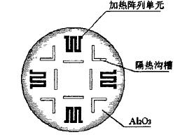 圖1是風(fēng)速風(fēng)向傳感器的加熱面。四個對稱分布的加熱陣列單元是加熱芯片,一般為鉑膜熱敏電阻,用于對稱地加熱芯片,使其高于周圍溫度。圖2是感溫陣列單元的陣列芯片,邊上四個呈對稱分布,中間一個芯片用于測量芯片的溫度。