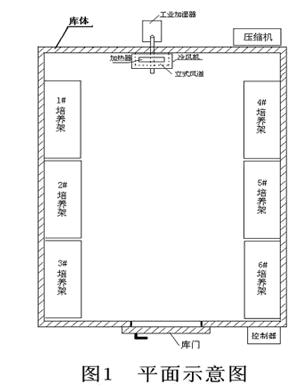 溫度系統(tǒng)由加熱器、壓縮機(jī)組、冷風(fēng)機(jī)、立式風(fēng)道、溫度傳感器和控制系統(tǒng)等組成。壓縮機(jī)組采用高效的法國(guó)美優(yōu)樂(lè)MT36(3匹)全封閉壓縮機(jī)(含進(jìn)口附配件)。冷風(fēng)機(jī)采用國(guó)產(chǎn)30m2高效低噪音冷風(fēng)機(jī)。溫度傳感器采用進(jìn)口(寧波組裝)KL型高精度熱敏電阻,具有精度高、可靠性極高。壓縮機(jī)組用支架安裝在室外,并用機(jī)罩罩住。冷風(fēng)機(jī)安裝在房門(mén)對(duì)面的頂板上,冷風(fēng)機(jī)的進(jìn)口處與位于其下的立式風(fēng)道相連接,立式風(fēng)道的進(jìn)風(fēng)出在其底部?jī)蓚?cè),如圖2所示。加熱器安裝在風(fēng)道內(nèi)。