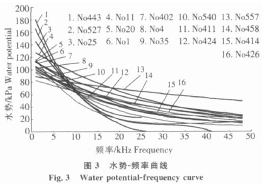利用在山東禹城試驗(yàn)站和河南封丘試驗(yàn)站進(jìn)行的土壤水分傳感器適應(yīng)性分析得出以下分析數(shù)據(jù):假設(shè)傳感器測(cè)量頻率的量程為0~50 kHz。在該量程范圍內(nèi),依據(jù)土壤水分傳感器的標(biāo)定曲線,繪制各個(gè)傳感器的水勢(shì)2頻率曲線,按率定公式計(jì)算的水勢(shì)隨頻率的增加而增大(圖3) 。