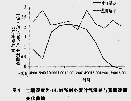 3) 土壤濕度< 15 %時,上午蒸騰速率隨著隨小麥葉氣溫差的增加而加大,12 :00 之后,蒸騰速率并不隨小麥葉氣溫差增加而增強,未表現(xiàn)出規(guī)律性。當土壤濕度超過15 %以后,從上午開始,小麥葉氣溫差和蒸騰速率的變化趨勢就相反。