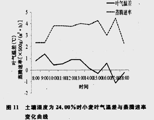 由圖7 - 11 可以看出,土壤濕度< 15 %時,在上午的11 :00 之前,蒸騰速率隨著小麥葉氣溫差的增加而加大,12 :00 之后,蒸騰速率并不隨著小麥葉氣溫差的增大而增強,未表現(xiàn)出規(guī)律性。當土壤濕度超過15 %以后,水分的充分供應(yīng)既保證了較高的蒸騰速率,也有效降低了葉片溫度,減小了小麥葉氣溫差,從上午開始,小麥葉氣溫差和蒸騰速率的變化趨勢就相反。