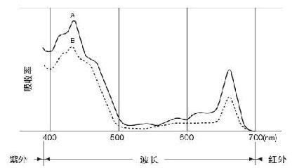 從圖中可以看出,葉綠素在藍色區(qū)域(400—500nm)和紅色區(qū)域(600—700nm)范圍內(nèi)吸收達到了峰值,但在近紅外區(qū)域卻沒有吸收。也就是說,不同波長的光線,葉綠素的吸收量是不同的。這也正好符合了我們的要求,通過不同的吸收量,來測出spad值。