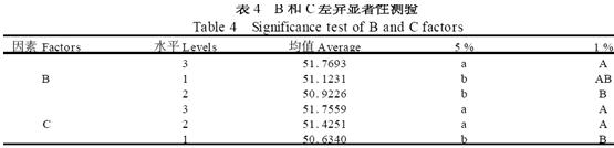 對粗脂肪含量數據進行直觀分析(表2) ,比較3個因素的極差( R) ,可見RC(1 . 1219) > RB