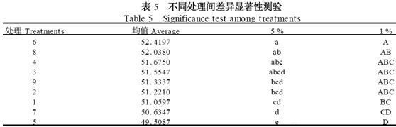 (0. 8468) > RA (0. 1343) ,即淋洗時間對測定結果影響最大,其次是浸提時間,浸提溫度的影響最小。方差分析結果表明(表3) ,因素B (浸提時間) 和因素C(淋洗時間) 各水平間差異顯著, 因素A(浸提溫度) 各水平間差異不顯著。由于因子A 不同水平間差異不顯著,結合B、C 因素各水平間的平均數和顯著性測驗結果(表4) ,B3C3 和B3C2 應為較好的提取方案。它們相對應于處理3 (A1B2 C3 )和處理6 (A2B3 C2 ) ,在9 個處理中分別位于第四位和第一位(表5) 。綜上所述,A2B3 C2 應為最優組合,即浸提溫度120 ℃、浸提時間80 min、淋洗時間30 min 為花生粗脂肪的最佳提取方案。