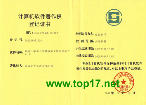熱烈祝賀浙江托普土壤水分有機(jī)質(zhì)測(cè)量?jī)x器系統(tǒng)軟件獲軟件著作權(quán)證!