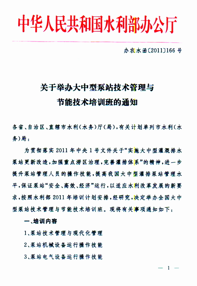 關于舉辦大中型泵站技術管理與節(jié)能技術培訓班的通知