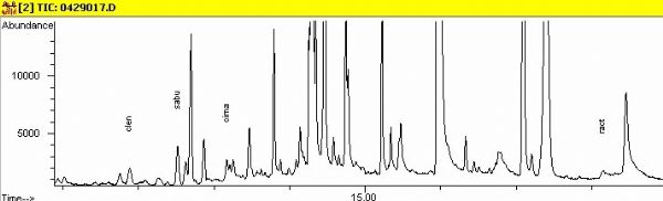 將上述盛有殘渣的具塞玻璃試管放入50℃烘箱中加熱片刻,除去水分后,加入甲苯100mL和雙三甲基硅基三氟乙酰胺(BSTFA)100mL,渦旋振蕩20s,密封玻璃塞,置于80℃恒溫烘箱中加熱1小時,冷卻后加入300mL甲苯,作為試樣溶液,供氣相色譜-質(zhì)譜分析(色譜柱:DA-5MS, 30m×0.25mm×0.25µm,P/N:1525-3002)。