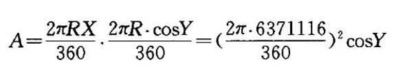 式中:R為地球半徑,x為經(jīng)度/m,y 為緯度/m。則在地球表面Y經(jīng)度處,經(jīng)度差、緯度差各為一度的方格面積為: