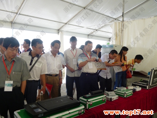 會議第二天,代表們參觀了小湯山國家精準農業研究示范基地和國家現代農業科技城農業物聯網綜合服務平臺。全國農技中心栗鐵申副主任、全國農技中心標準信息處湯金儀處長在托普儀器公司陳渝陽總經理的帶領下參觀了托普展臺展示出的無線多點土壤墑情監測系統、農藥殘留速測儀、葉綠素測定儀、葉面積測定儀、土壤養分速測儀等一系列自產農業儀器,并對托普自產的農藥殘留速測儀大加贊賞。