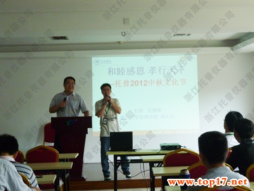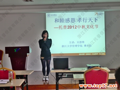 2012年9月22日,在中秋佳節(jié)來臨之際,浙江托普儀器有限公司在公司內(nèi)部舉辦了一場(chǎng)2012年中秋文化節(jié)活動(dòng)。活動(dòng)圍繞“和睦感恩,孝行天下”的主題開展,并邀請(qǐng)浙江大學(xué)管理學(xué)院吳恩峰博士前來培訓(xùn)講解。