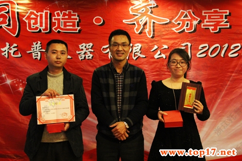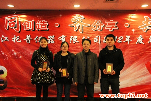 在各部門經理、分管副總以及總經理進行總結完畢后,下午15:00會議進行第四個議程:表彰優秀主管和優秀員工。浙江托普儀器有限公司2012年度共評選出優秀主管、最佳進步獎、優秀班組長、優秀員工、最佳新人23名。