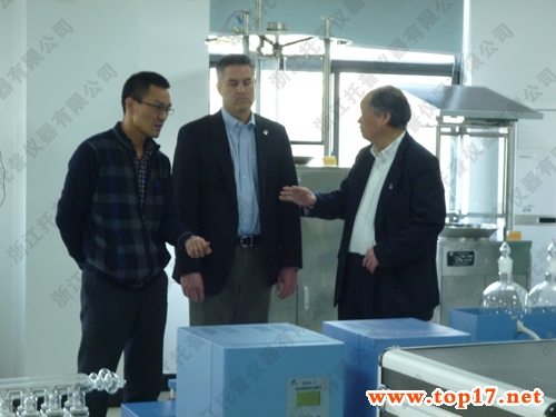 圖為:加拿大泰克資源安德魯·格林教授、國際鋅協(xié)會樊明憲教授參觀托普儀器產(chǎn)品