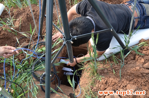 圖為:托普儀器技術人員現(xiàn)場安裝土壤水分溫度定點檢測及遠程傳輸系統(tǒng)