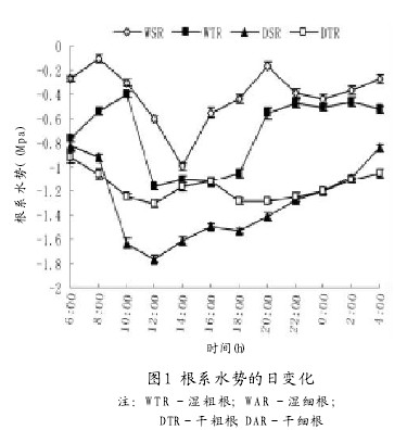 葉水勢和土壤水勢用PSΨPRO水勢儀進行測定;葉片水勢和根系水勢測定平衡時間約為0.5h;每隔2h取根和葉片用根系分析儀測定,小于0.5mm的細根測定根表面水勢,2~3mm 的粗根測定根橫截面水勢。土壤水勢探頭在移栽時埋置于盆缽土體的根系密集區,根系含水量取粗根稱重烘干測定。