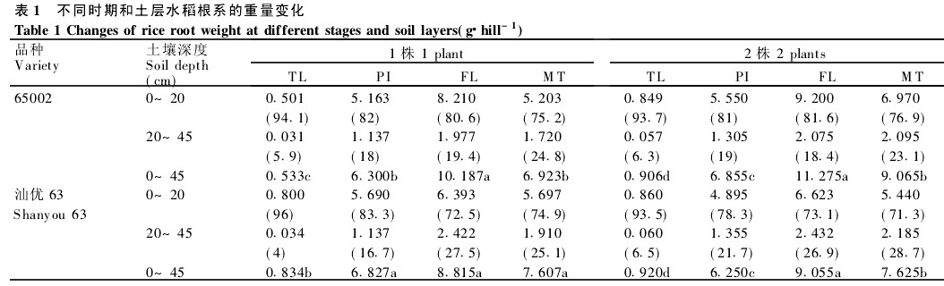根系重量以開花期為最大,從分蘗期到開花期根系重量為增長(zhǎng)階段,開花后為下降階段.1998年根系生長(zhǎng)動(dòng)態(tài)與1999年趨勢(shì)相同,現(xiàn)以1999年資料為例說明.開花期總根量除汕優(yōu)63單本種植外其它處理均顯著高于其它時(shí)期,分蘗期根量顯著低于其它時(shí)期(表1).65002從分蘗期到穗分化期和穗分化期到開花期根系重量平均增長(zhǎng)519和411g,開花期到成熟期根量平均下降218g.汕優(yōu)63從分蘗期到穗分化期和穗分化期到開花期根系重量平均增長(zhǎng)517和214g,開花期到成熟期根量平均下降114g(表1).由此可見,水稻根系重量的主要增長(zhǎng)期在分蘗期到穗分化期.花后根系重量下降主要發(fā)生在0~20cm耕層中,65002和汕優(yōu)63分別下降2162g和0194g,而土層20~45cm的深層根系重量下降相對(duì)較小(表1).每筒種植2株比1株各生育期根量均增加.