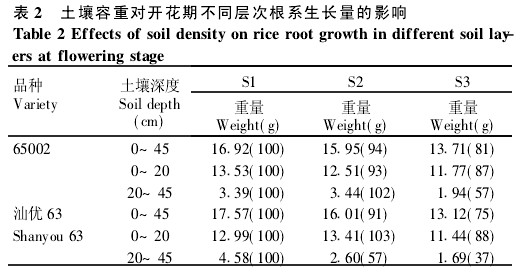 以土壤容重標(biāo)示的土壤緊密度影響根系的生長(zhǎng),隨土壤容重提高,開花期水稻根系生長(zhǎng)量下降.以112g#cm-3土壤容重的根系生長(zhǎng)量為100%,在114g#cm-3和116g#cm-3土壤容重下65002根系生長(zhǎng)量分別為94%和81%,下降6%和19%,汕優(yōu)63分別為91%和75%,下降9%和25%(表2).