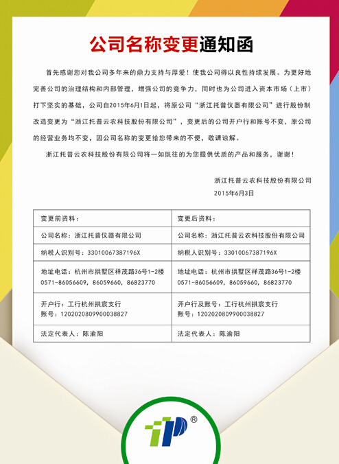 PS:浙江托普云農科技股份有限公司注冊資金由原來的1000萬變更為5000萬,公司經營業務不變,公司開戶行和賬號等均不變,托普云農將一如既往的為您提供優質的產品及服務!