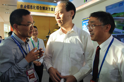 7日下午,農業部余欣榮副部長、農業部市場與經濟信息司王小兵副司長一行蒞臨托普展區,就農業物聯網相關問題與陳渝陽總經理、朱旭華副總經理親切交流。余副部長表示,在科技飛速發展的今天,農業物聯網的系統及硬件技術已經相對成熟,但是除此之外,還要與射頻技術緊密結合,進一步拓展技術領域,提高農業物聯網的科技含量。
