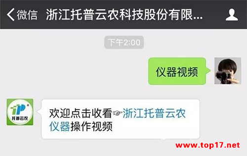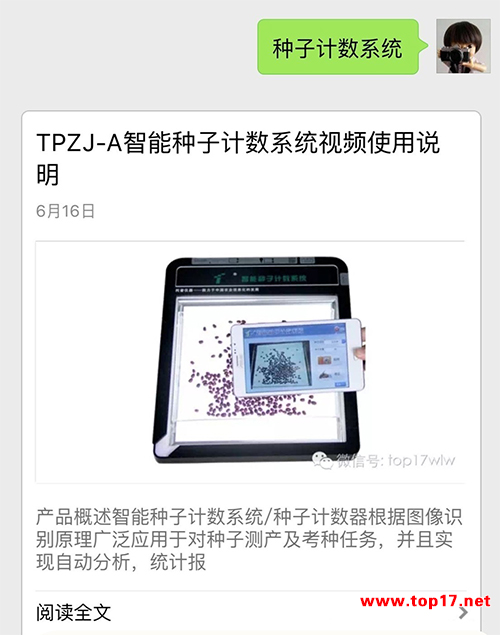 現(xiàn)在只需關(guān)注“浙江托普云農(nóng)科技股份有限公司”的微信公眾號,回復對應的關(guān)鍵字,即可查看儀器操作視頻,比如需要查看智能種子技術(shù)系統(tǒng)的操作視頻,只需要回復“種子計數(shù)系統(tǒng)”或者儀器型號即可了解如何使用儀器,查看儀器的相關(guān)參數(shù)和功能。