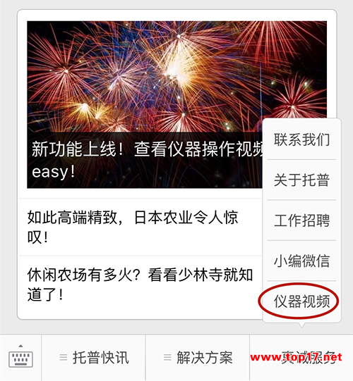 在“浙江托普云農(nóng)科技股份有限公司”微信號的菜單欄也提供了查看視頻的入口,只需要選擇“真誠服務”→“儀器視頻”即可進入頁面查看。