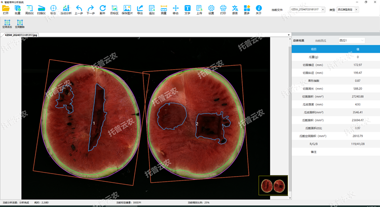 8.瓜果表型分析:用于測(cè)量西瓜切面的瓜瓤、瓜皮等果形指標(biāo),可自動(dòng)分析切面橫徑、切面縱徑、果形指數(shù)、切面周長(zhǎng)、切面面積、瓜皮厚度、瓜皮面積、瓜瓤面積、瓜瓤空洞面積、顏色以及瓜重等果形參數(shù),軟件支持圓形水果表型測(cè)定,也可支持定制其它園藝作物果實(shí)切面表型指標(biāo)。常用于西瓜果實(shí)育種、西瓜關(guān)鍵基因定位、逆境脅迫、西瓜表型指標(biāo)測(cè)定等領(lǐng)域。