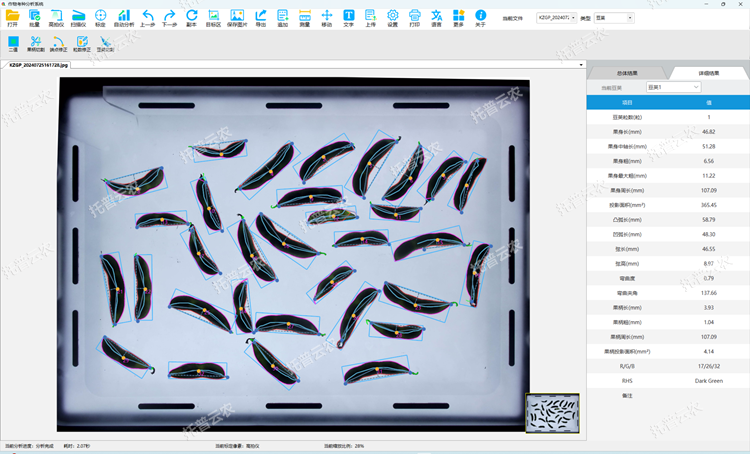 6.粒型指標(biāo)分析:可用于≥30種水稻、小麥、玉米、大豆、高粱、谷子、油菜,蔬菜、花卉等同粒型種子的粒型指標(biāo)分析,可對(duì)每一粒籽粒分析計(jì)算,分析種子的詳細(xì)結(jié)果:自動(dòng)檢測(cè)單粒種子的粒型參數(shù)(長(zhǎng)、寬、長(zhǎng)寬比、面積、周長(zhǎng))。也可分析各類(lèi)種子總結(jié)果:所有種子的總粒數(shù)、千粒重/百粒重、粒色、平均值(長(zhǎng)、寬、長(zhǎng)寬比、面積、周長(zhǎng))、標(biāo)準(zhǔn)差,半自動(dòng)檢測(cè)容重、水分,并可并輸出種子大小排列對(duì)比圖