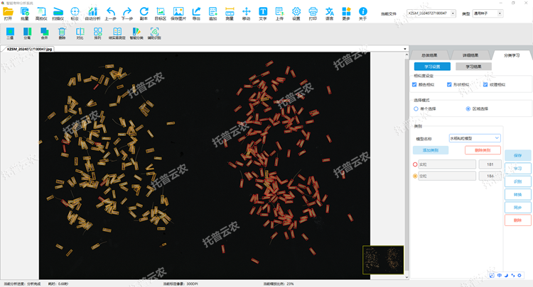 14.智能對(duì)比:能精準(zhǔn)顯示種粒外接矩形,對(duì)不同品種的種子進(jìn)行長(zhǎng)和寬的對(duì)比,并輸出排列、對(duì)比圖。深度學(xué)習(xí):根據(jù)顏色或是形狀的不同對(duì)種子進(jìn)行自學(xué)習(xí)和再學(xué)習(xí),并實(shí)現(xiàn)自動(dòng)分類(lèi)識(shí)別。