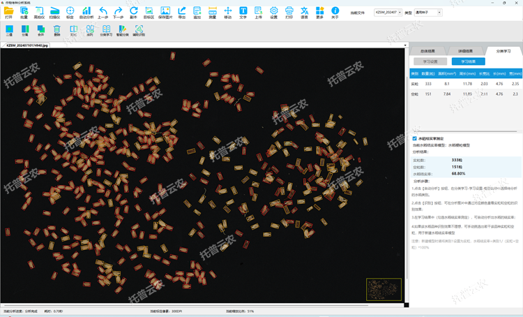 2.水稻結(jié)實(shí)率分析:能精準(zhǔn)顯示種粒外接矩形,得出空粒數(shù),實(shí)粒數(shù),結(jié)實(shí)率百分比數(shù)據(jù),并可直接標(biāo)記空粒、實(shí)粒,顯示各籽粒粒型數(shù)據(jù)(長(zhǎng)、寬、長(zhǎng)寬比、面積、周長(zhǎng)),可預(yù)設(shè)水稻粳粒結(jié)實(shí)率模型和水稻秈粒結(jié)實(shí)率模型,并支持根據(jù)自己的品種重新學(xué)習(xí)建模。