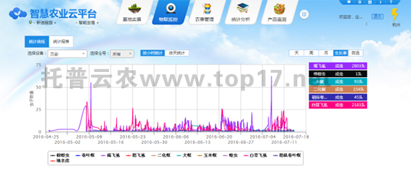 3.病蟲害預(yù)警系統(tǒng):對(duì)可遷移性害蟲實(shí)時(shí)分析,對(duì)即將發(fā)生及已發(fā)生蟲害區(qū)域做出決策,區(qū)域病蟲害信息可形成對(duì)比曲線。